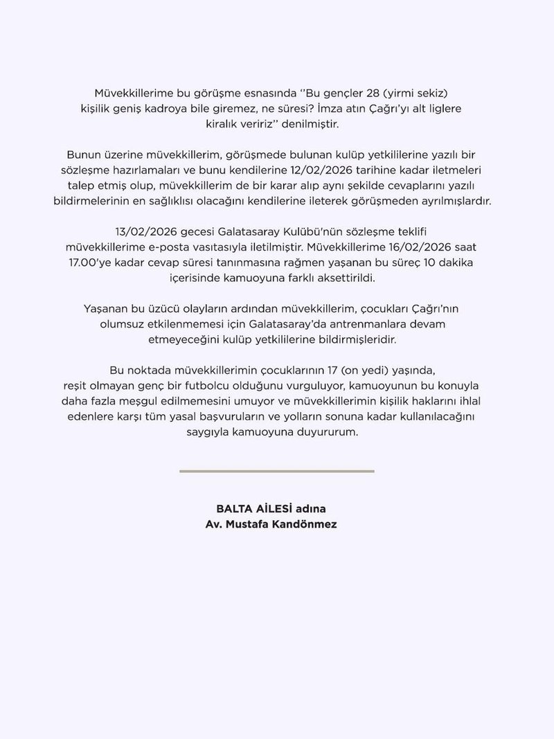 “Galatasaray, Çağrı’ya kendi yaş grubunda altyapı oyuncuları arasında en yüksek maaşı teklif etmesine karşın, müvekkillerim hiçbir maddi beklentilerinin olmadığını, dakika fark etmeksizin Çağrı’nın sezon içerisinde kadro rotasyonu yapılan sadece 3 maçta süre almasını istediklerini beyan etmişlerdir. Sözleşme imzalamak için Galatasaray’dan tek talepleri de bu husus olmuştur.”
