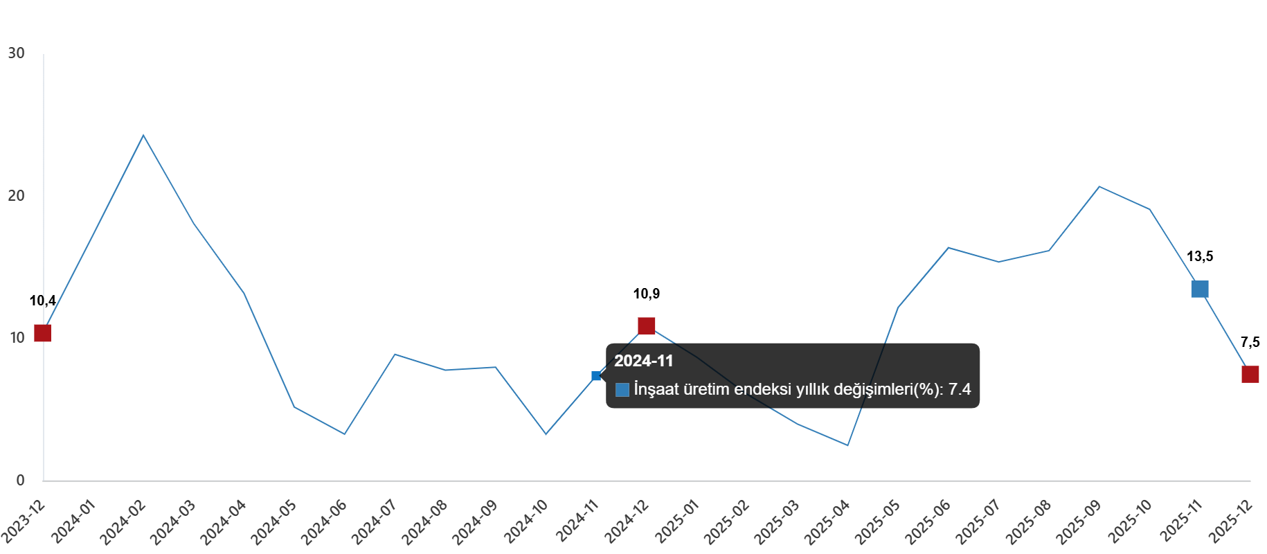 İnşaat üretim endeksi yıllık değişimleri(%), Aralık 2025