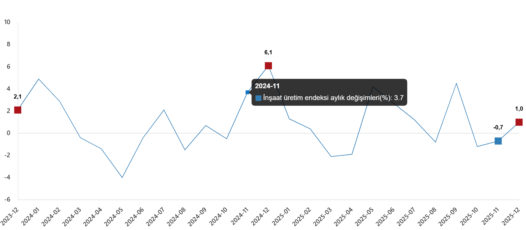İnşaat üretim endeksi aylık değişimleri(%), Aralık 2025