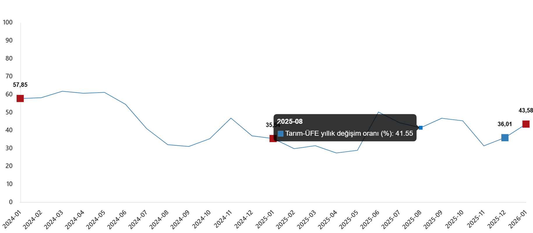 Tarım-ÜFE’de (2020=100), 2026 yılı Ocak ayında bir önceki aya göre %8,46 artış, bir önceki yılın Aralık ayına göre %8,46 artış, bir önceki yılın aynı ayına göre %43,58 artış ve on iki aylık ortalamalara göre %38,18 artış gerçekleşti.