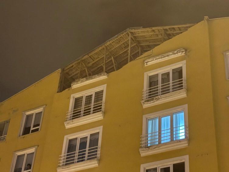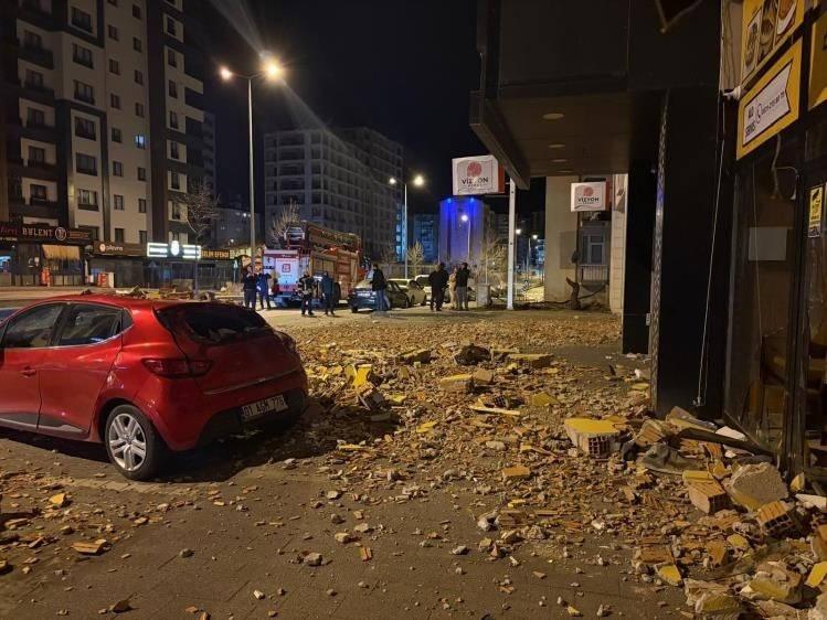 Molozlar binanın altında bulunan bir dükkanın camlarına ve park halindeki bir otomobile zarar verdi.
