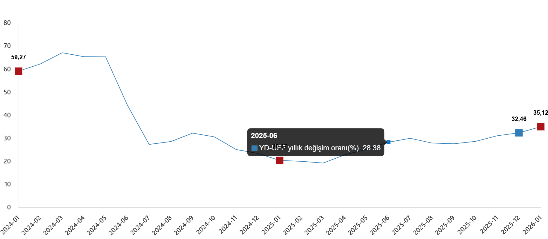 | Bir önceki yılın aynı ayına göre değişim oranı | 35,12 | 20,47 | 59,27 |
