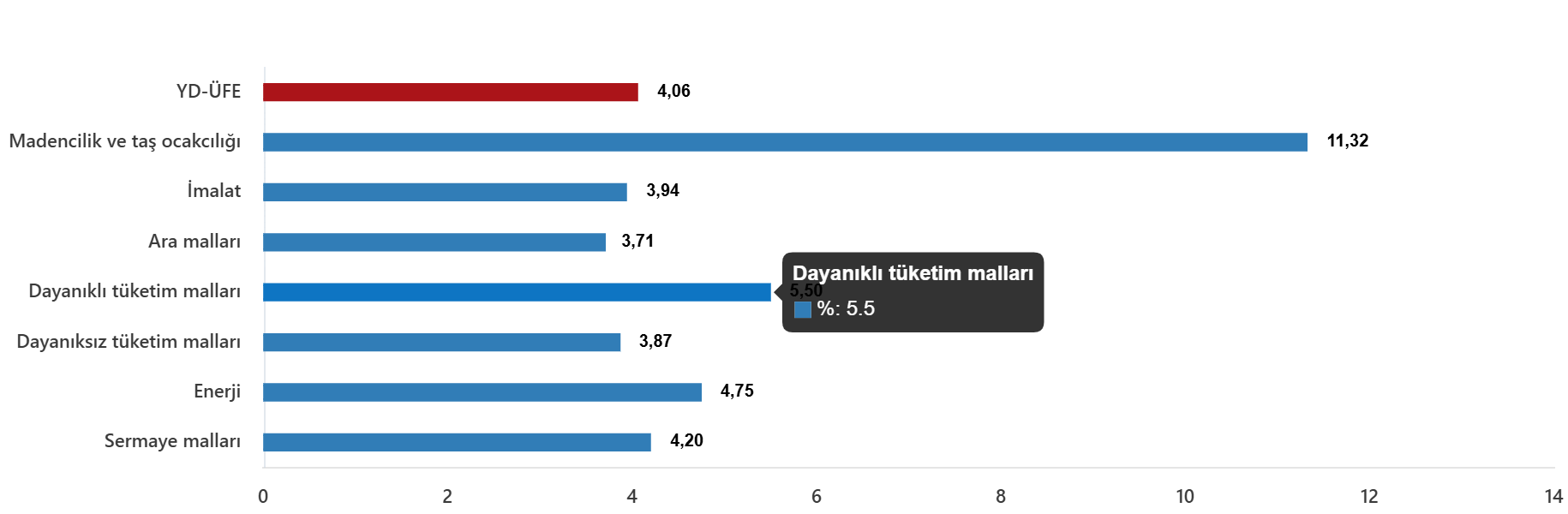 Ana sanayi gruplarının yıllık değişimleri; ara mallarında %32,71 artış, dayanıklı tüketim mallarında %46,09 artış, dayanıksız tüketim mallarında %42,14 artış, enerjide %11,00 artış, sermaye mallarında %35,06 artış olarak gerçekleşti.