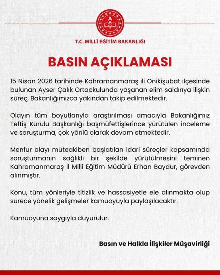“Olayın tüm yönleriyle incelenmesi için Bakanlığımız Teftiş Kurulu Başkanlığı başmüfettişleri tarafından yürütülen araştırma ve soruşturma, çok yönlü olarak devam etmektedir. Saldırının ardından başlatılan idari süreçler çerçevesinde, soruşturmanın sağlıklı bir şekilde yürütülebilmesi adına Kahramanmaraş İl Milli Eğitim Müdürü Erhan Baydur görevden alınmıştır. Konu, titizlikle ele alınmakta olup, sürece dair gelişmeler kamuoyuyla paylaşılacaktır.”